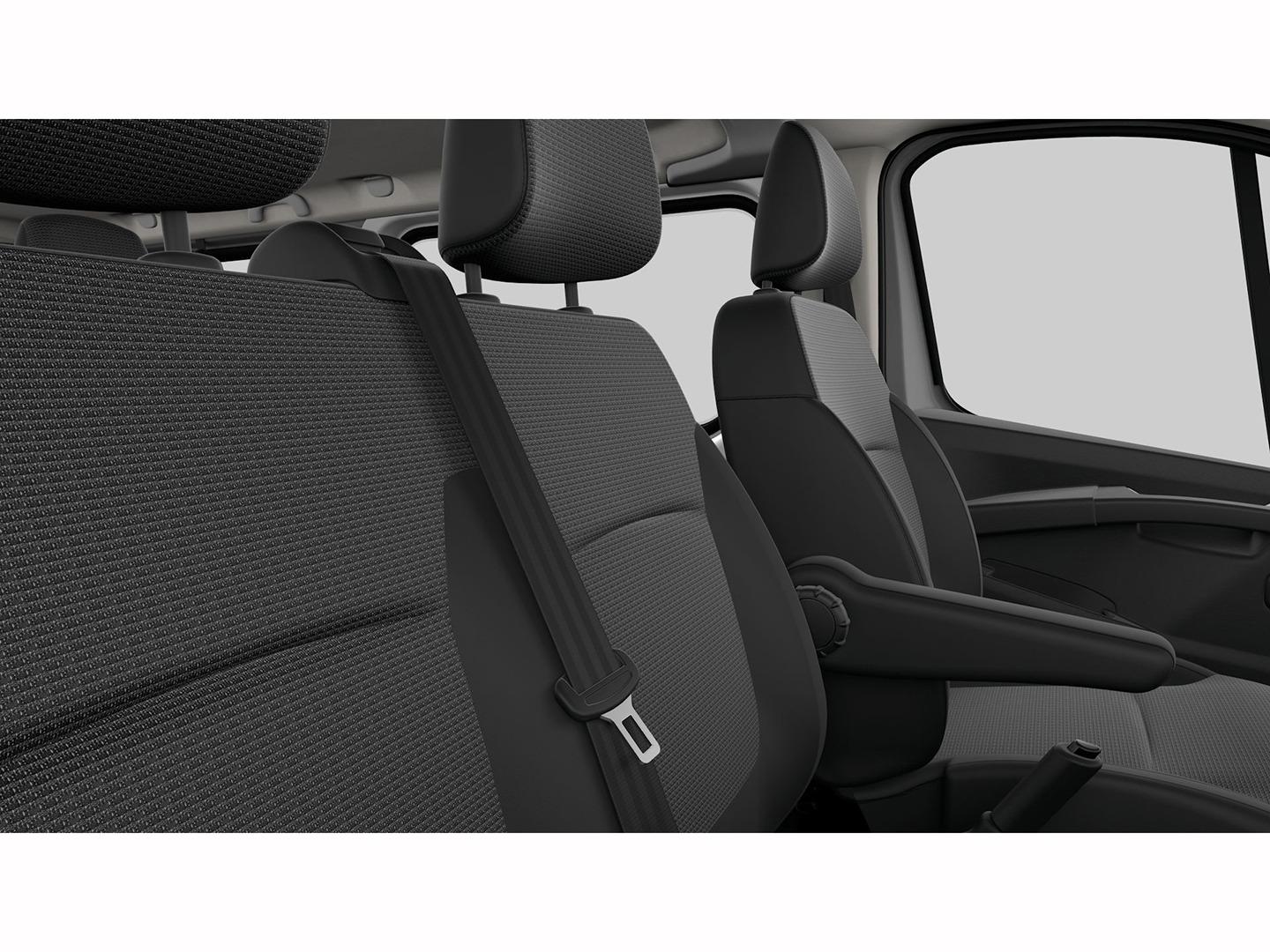 - Asiento delantero del conductor individual, ajuste longitudinal manual y ajuste manual en altura con ajuste manual del respaldo, asiento delantero del acompañante tipo banco, asiento delantero central tipo banco